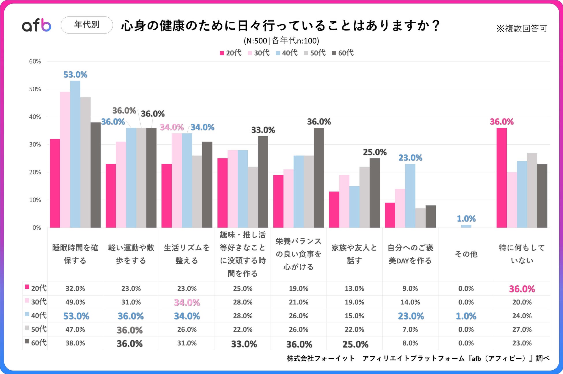 20代の36%が健康のために「特に何もせず」― 年代が上がるにつれセルフケア意識向上か