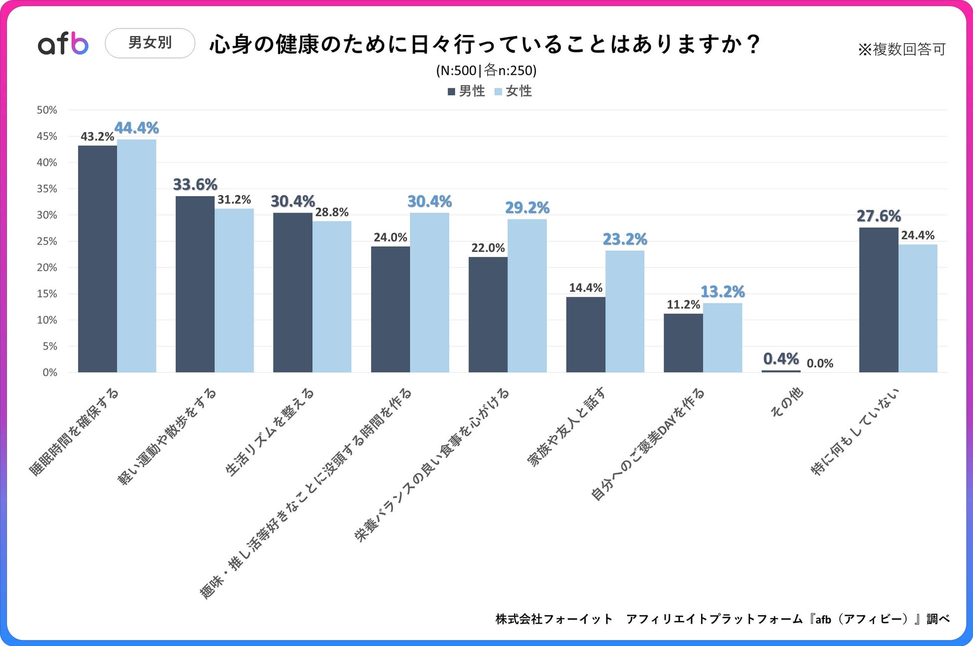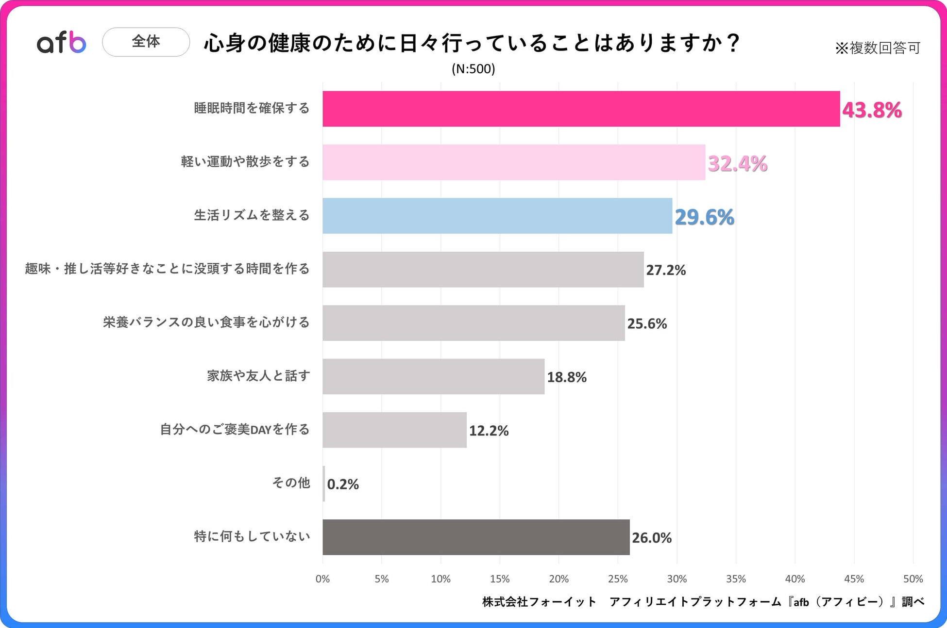 20代〜60代の男女を対象に、「心身の健康のために日々行っていることはありますか?」というアンケートを実施したところ、最も多かった回答は「睡眠時間を確保する」で43.8%でした。次いで、「軽い運動や散歩をする」が32.4%、「生活リズムを整える」が29.6%という結果になりました。一方、「特に何もしていない」と回答した方は26.0%でした。
