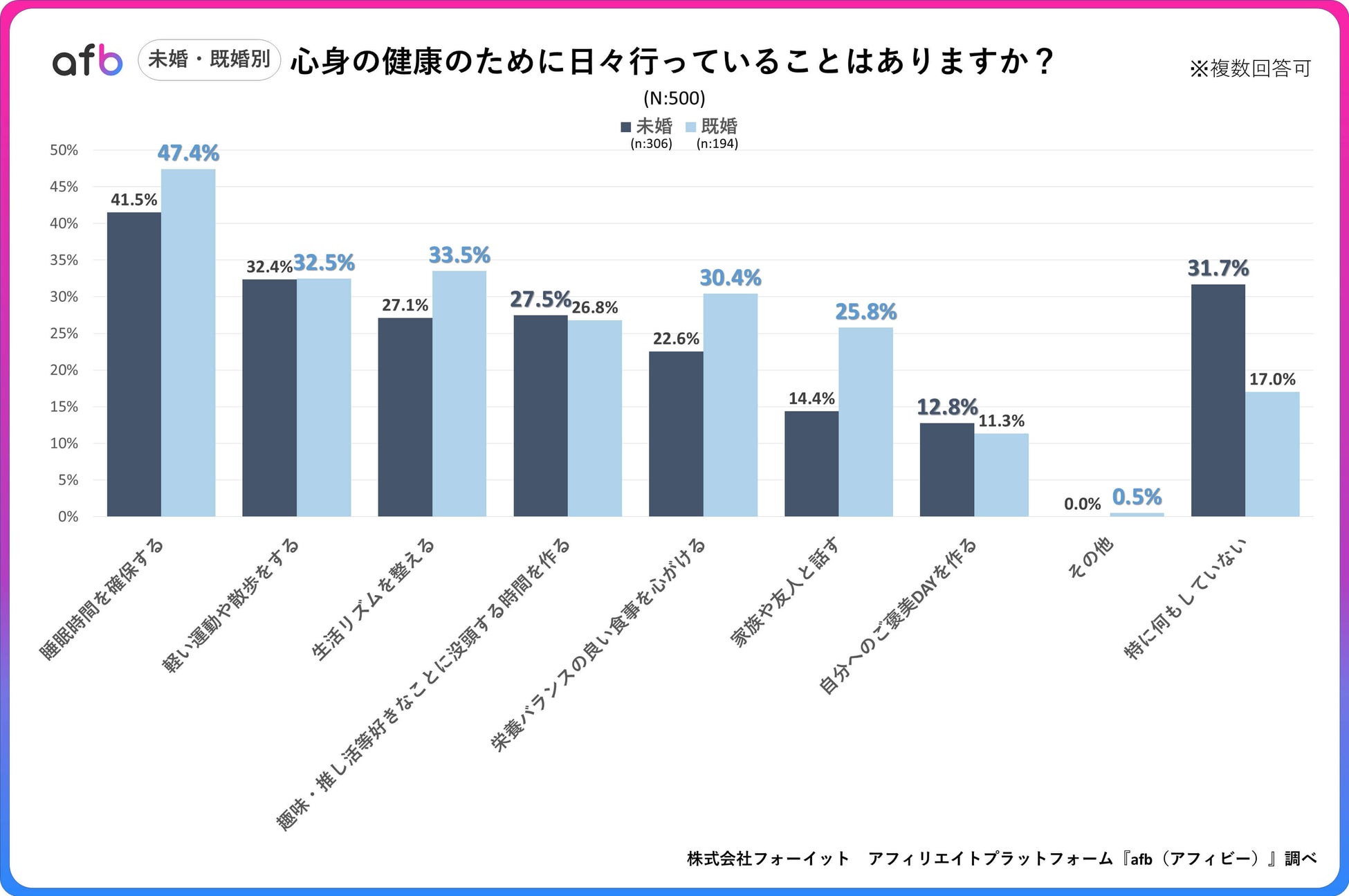 健康への取り組み、未婚者と既婚者で実施率に14.7%の差が