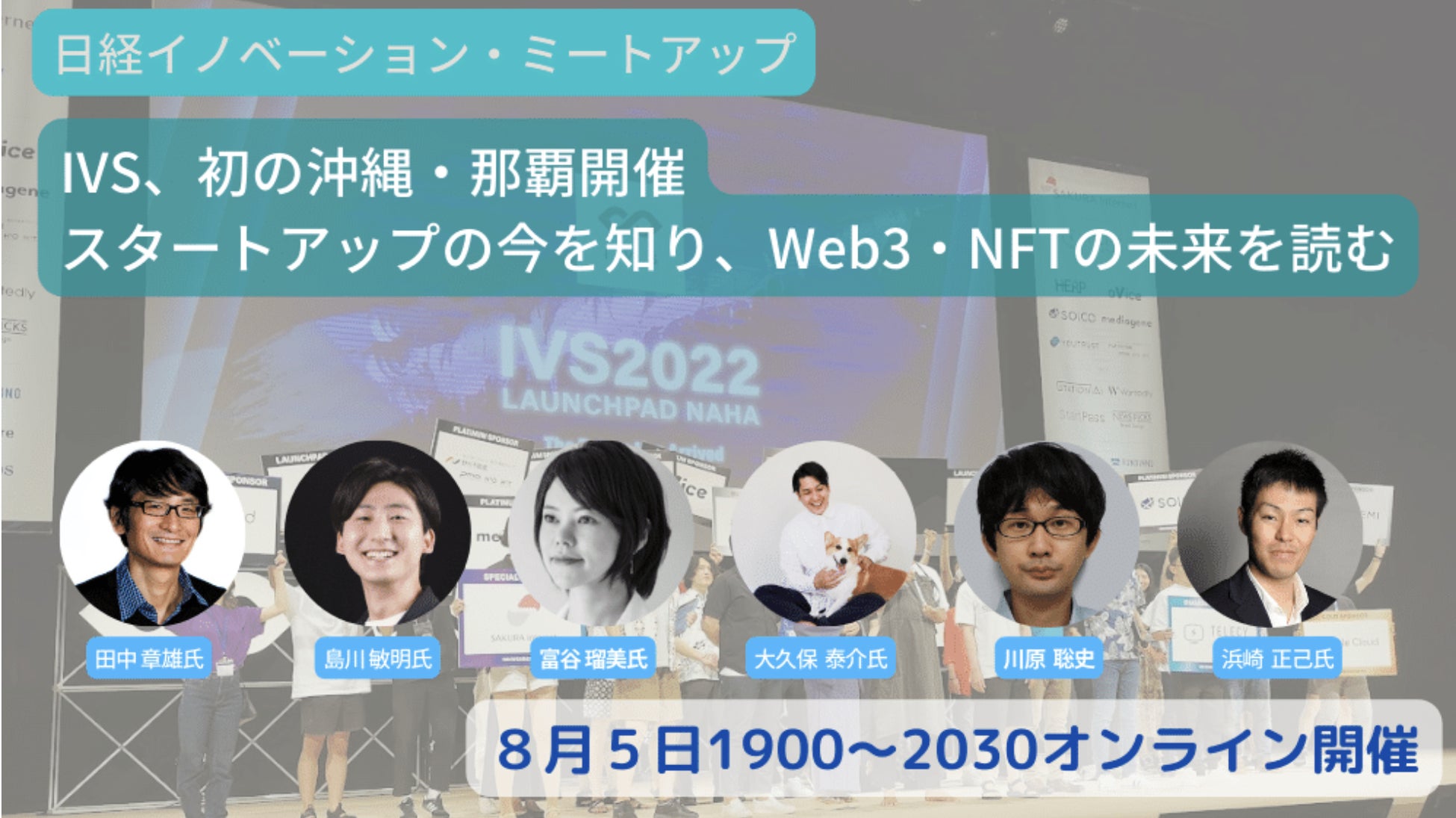 日本経済新聞社は日経イノベーション・ミートアップでは8月5日、7月に沖縄県那覇市で開催されたスタートアップ関連カンファレンス「IVS2022 NAHA」の報告会を開催します。今回のIVSではいわゆるスタートアップの活動状況に加え、Web3やNFTなどと呼ばれる新しいイノベーションの領域についても取り上げられ、日本のスタートアップの現状を俯瞰するものとなっています。IVSは日本の中でも歴史のあるスタートアップ関連カンファレンスです。今回は、Web3に特化した「IVS Crypto」を同時開催し、参加者数も1800人に達しました。