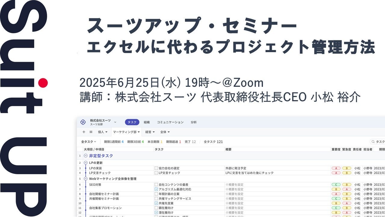 株式会社スーツ(所在地:東京都千代田区、代表取締役社長CEO:小松 裕介)は、2025年6月25日(水)19時から、当社代表の小松が講師を務めるスーツアップ・セミナー「エクセルに代わるプロジェクト管理方法」を無料開催します。