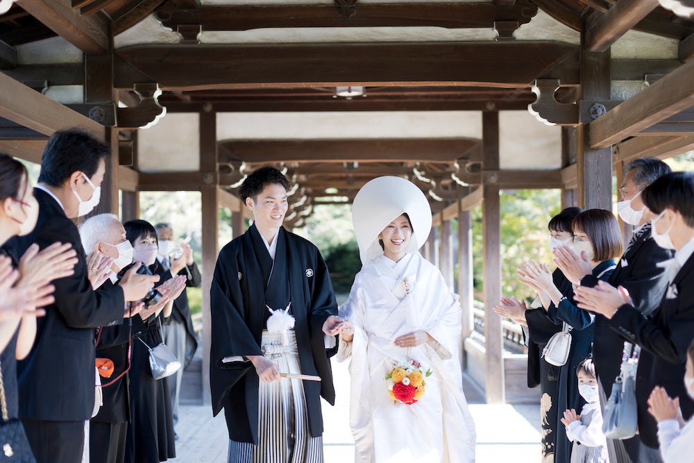 通常、平安神宮会館では披露宴からご参列される方には、披露宴会場へご案内をしています。本プラン限定で、披露宴から参列される方も挙式後に神苑での花道や写真撮影にご参加いただけます。結婚式に参列される方は、神苑の入園料も無料です。