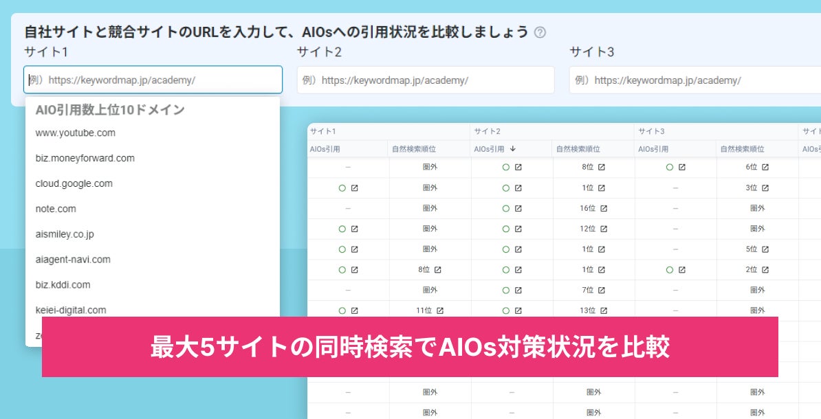 Keywordmap、AI Oveviewsの分析が可能な「AIOs出現レポート」機能をアップデート 最大5サイトを横断した引用分析・ブランド名の検索に対応し、AI検索時代の競合分析が可能に
