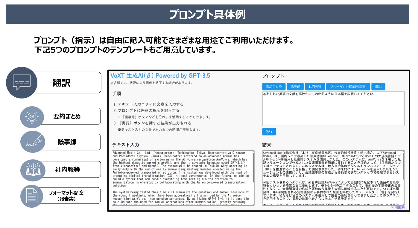 「VoXT生成AI(β)Powered by GPT-3.5」は、会議の文字起こし結果などのテキストに対して、任意のプロンプト(指示)を入力することで、文章の要約や翻訳を簡単に行うことができるクラウドサービスです。要約や翻訳のほか、インタビューやスピーチなどの原稿作成や情報整理など、幅広い業務に活用することができ、業務の質の向上と効率化を支援します。