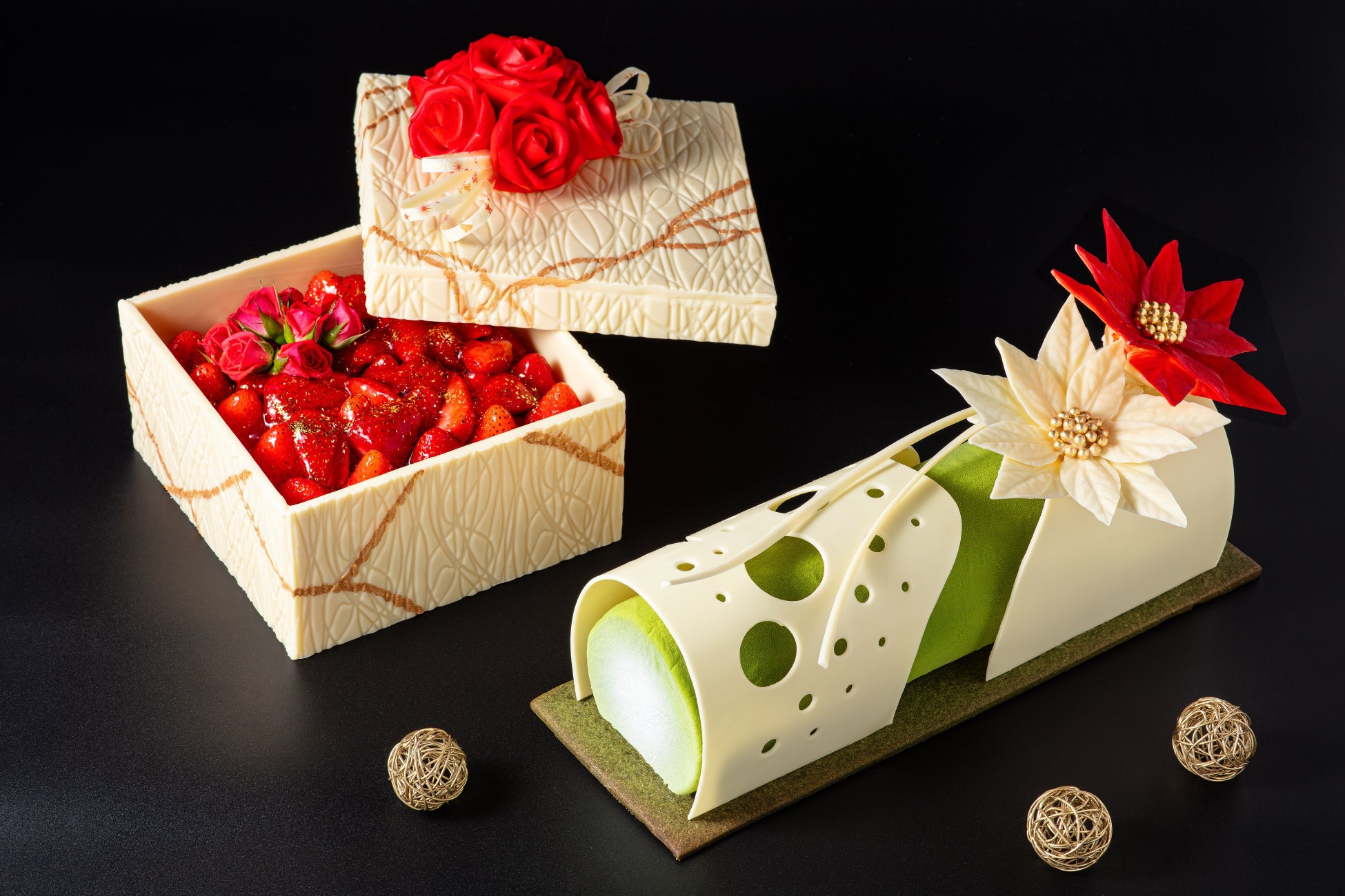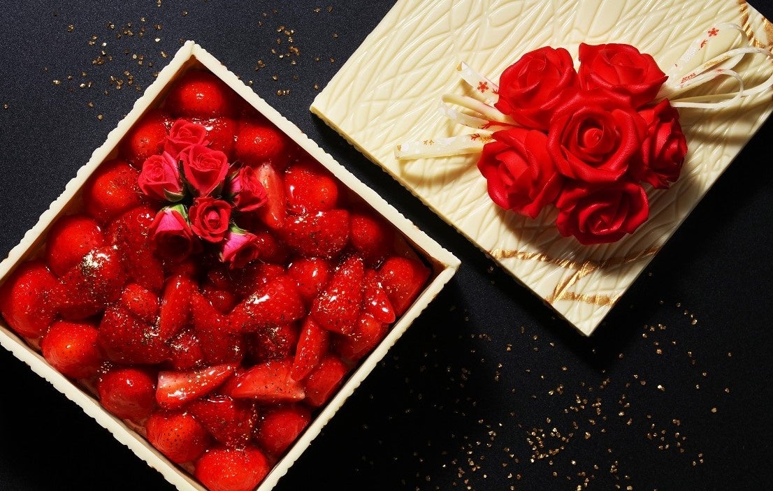真っ赤なバラのデザインが特徴的な「ビジュー ルージュ」はシャンパンとベリーの香りが広がるおとなの味わい。「メルヴェイユ」は、マスカルポーネクリームとホワイトチョコレートクリームの濃厚な味わいを瑞々しいあまおうが引き立てる定番のショートケーキです。
