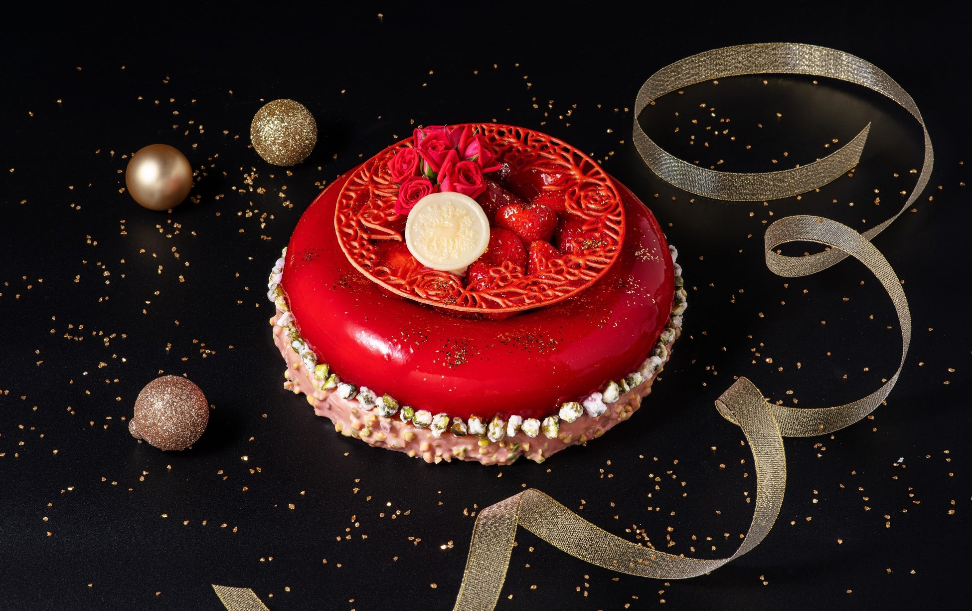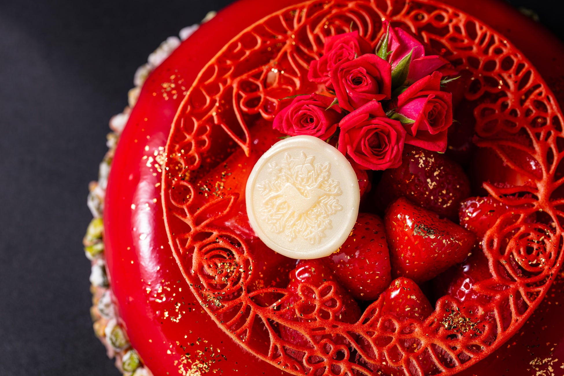 洗練された真っ赤なバラのデザインが特徴のムースケーキ。苺の「あまおう」の甘酸っぱさと、シャンパン入りのベリーコンフィチュールの香りが広がるおとなの味わい。ラズベリーグラサージュをかけた赤く艶めくムースに苺をたっぷりとのせ、ルビーチョコレートと刻みピスタチオでコーティングしたタルト生地とともに食感をお楽しみいただけます。