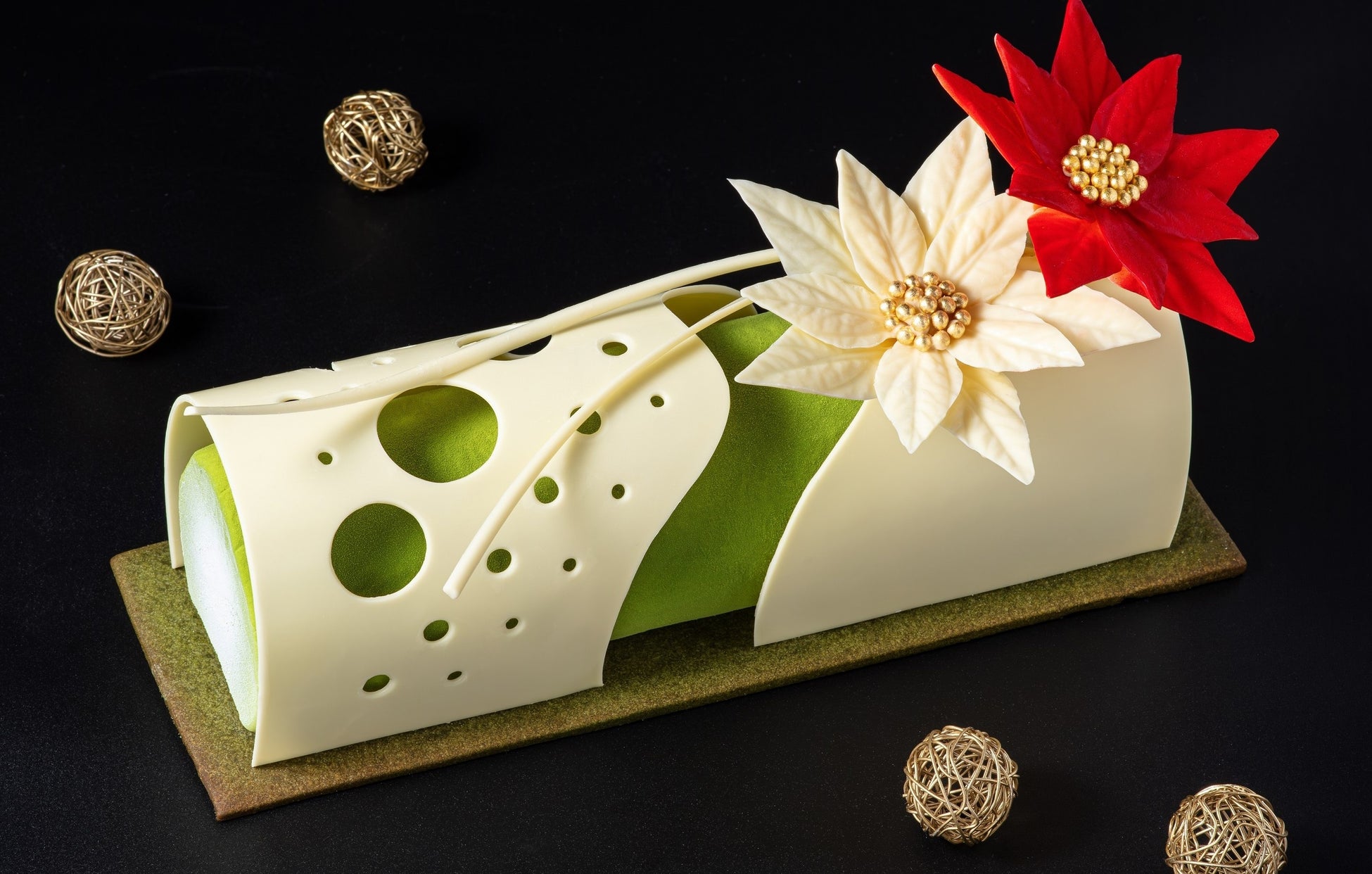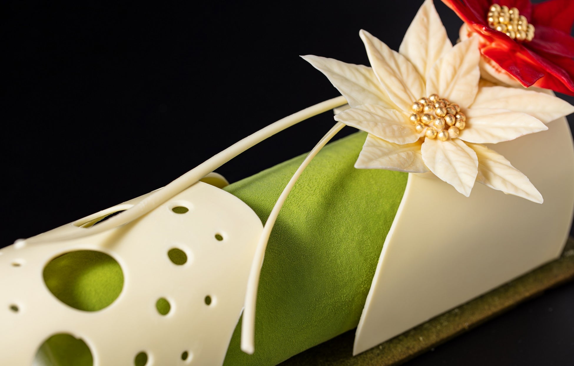 ホテルの日本庭園を優しく照らす竹あかりがモチーフのムースケーキ。福寿園の宇治抹茶香るホワイトチョコレートムースの中に、刻んだ渋皮栗入りのアーモンド生地や、栗のブリュレ、グロゼイユとラズベリーのコンフィチュールなどを閉じ込めた深みのある味わい。竹あかりのデザインをイメージしたホワイトチョコレートとポインセチアを添えた優雅なひとときを演出するデザインです。
