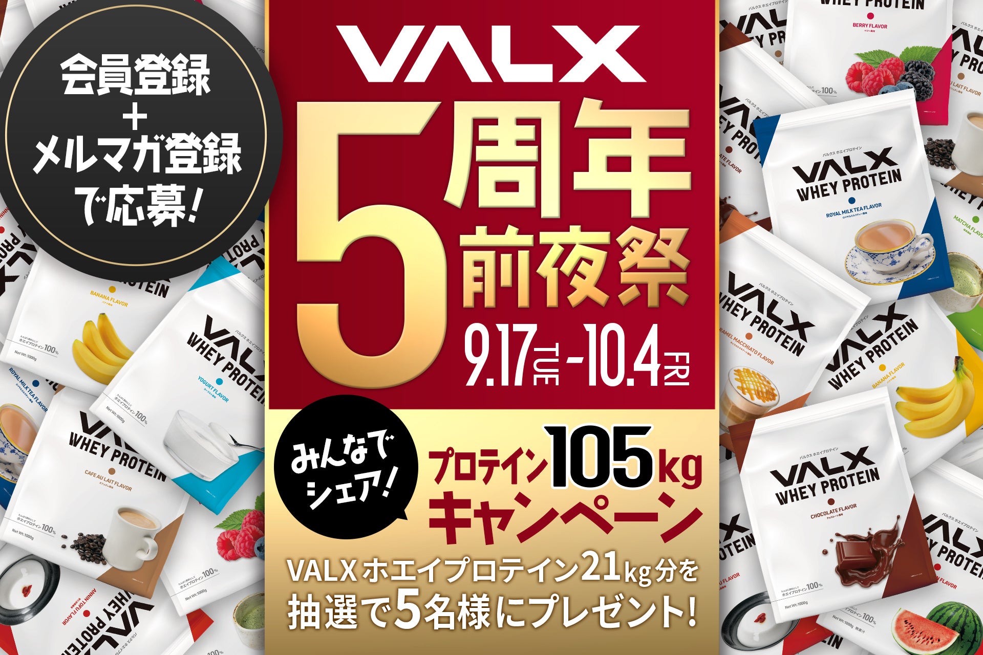 それを記念して、みなさまへの感謝と「特別なこの1年を一緒に盛り上げていきたい」という想いのもと、2024年9月17日(火)より【VALX5周年 前夜祭】と称して抽選で5名様に合計105kgの「VALX ホエイプロテイン」をプレゼントするキャンペーンを開催いたします。
