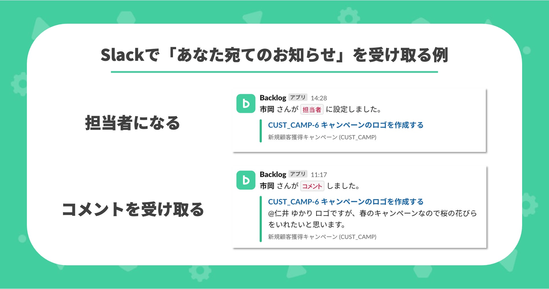 現在Backlogの「あなた宛てのお知らせ」より通知している事項を、チャットツールのダイレクトメッセージより受け取ることができます。