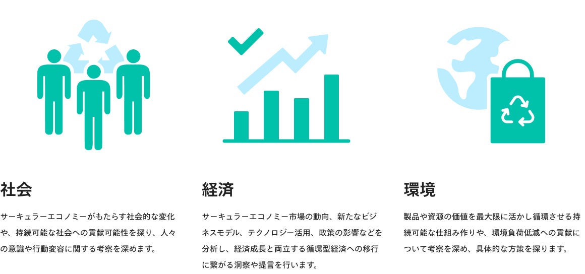 主な調査・研究テーマ:「社会(Society)」「経済(Economy)」「環境(Environment)」の3つの視点から、情報発信を行います。