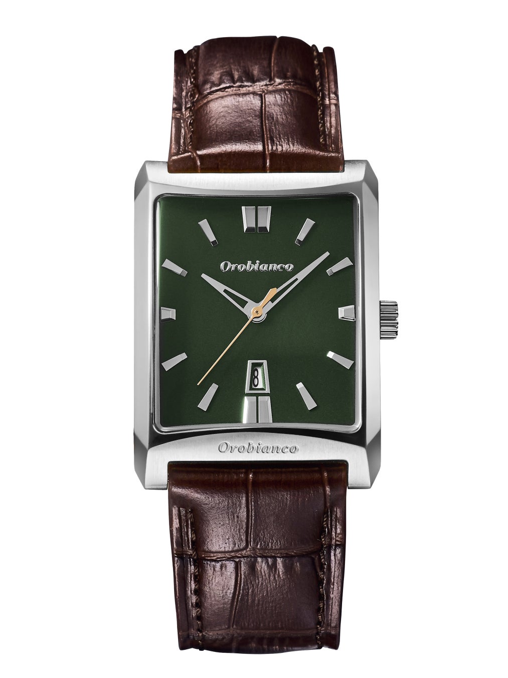 イタリアンテイストを取り入れたユニークな形のケースと日常使いしやすい日付表示も文字盤の6時位置にいれたミニマムウォッチです。ケースの角がぶつからないよう設計されたサイズ感です。