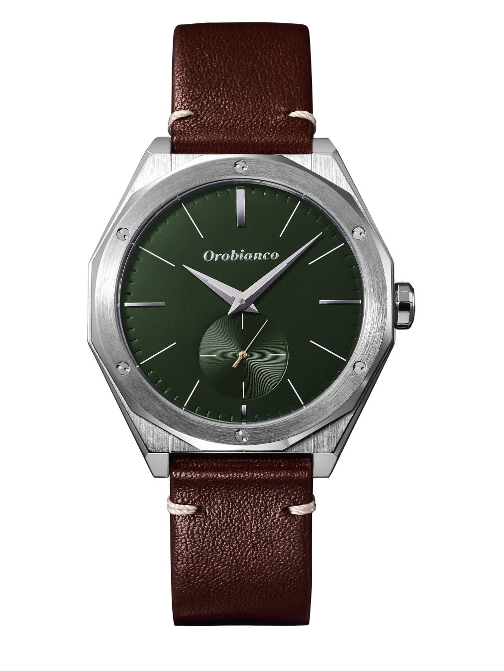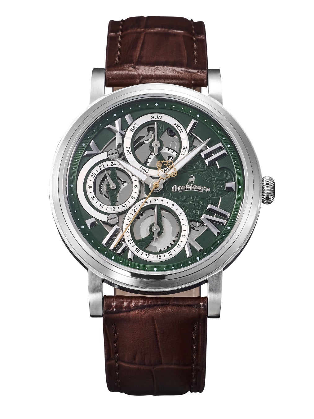 グリーンの文字盤と、シルバーに輝くムーブメントがコントラストを生んでいます。インデックスには大きめのローマ数字を採用し、クラシカルなフォルムに遊び心を加えました。日常使いにも便利な日付・曜日・24時間計付き。