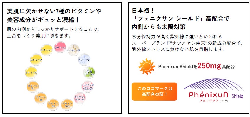 モイストラボはスキンケア発想のシリーズとして「日中も紫外線を気にせず美しい肌を目指したい」というお客様の声にこたえ、内側からもケアして明るく澄んだ肌を目指し太陽対策ができるビューティケアサプリを発売いたします。2種類のビタミンCをベストなバランスで配合。ブライト白玉EX成分でくすみのないふっくらと白玉のような肌を目指します。さらに11種ものビタミンなど美肌に欠かせない成分をたっぷり配合。そして紫外線に強く水分保持力の高いナツメヤシ由来の新成分を日本で初めて採用することで、紫外線ストレスに負けない強い肌を目指します。