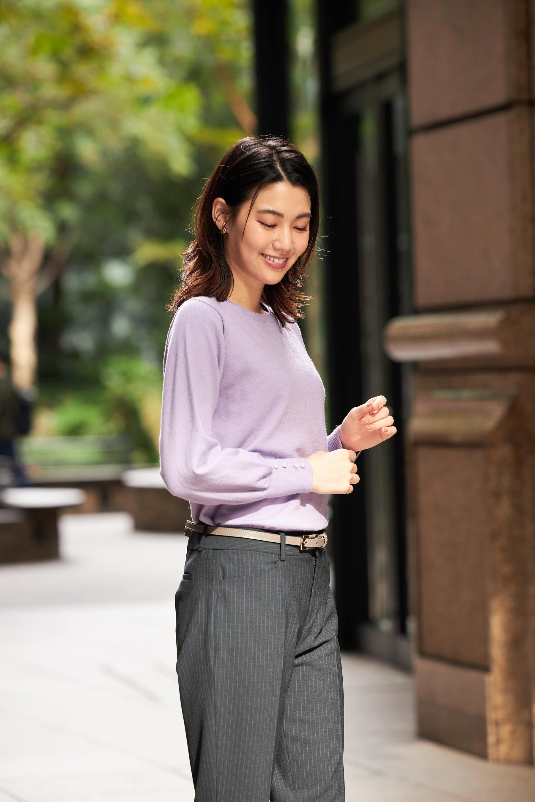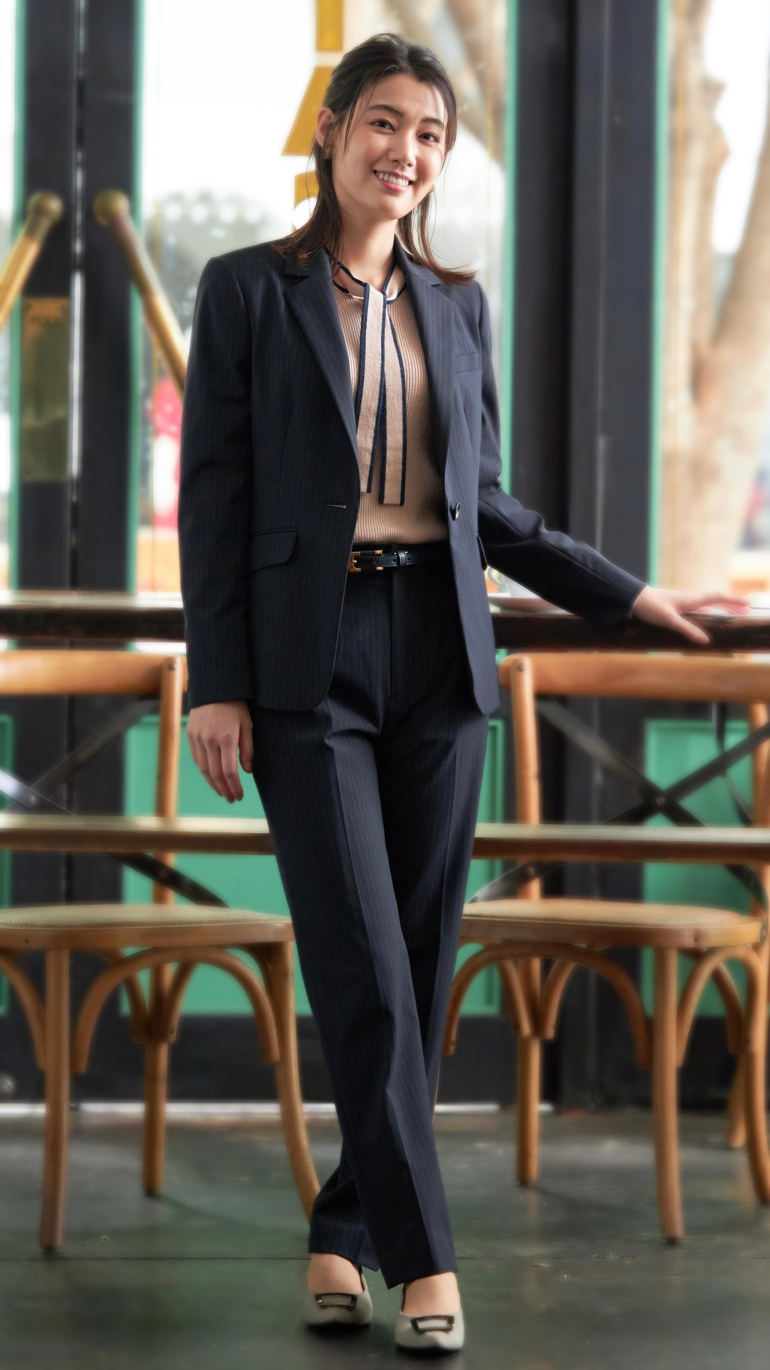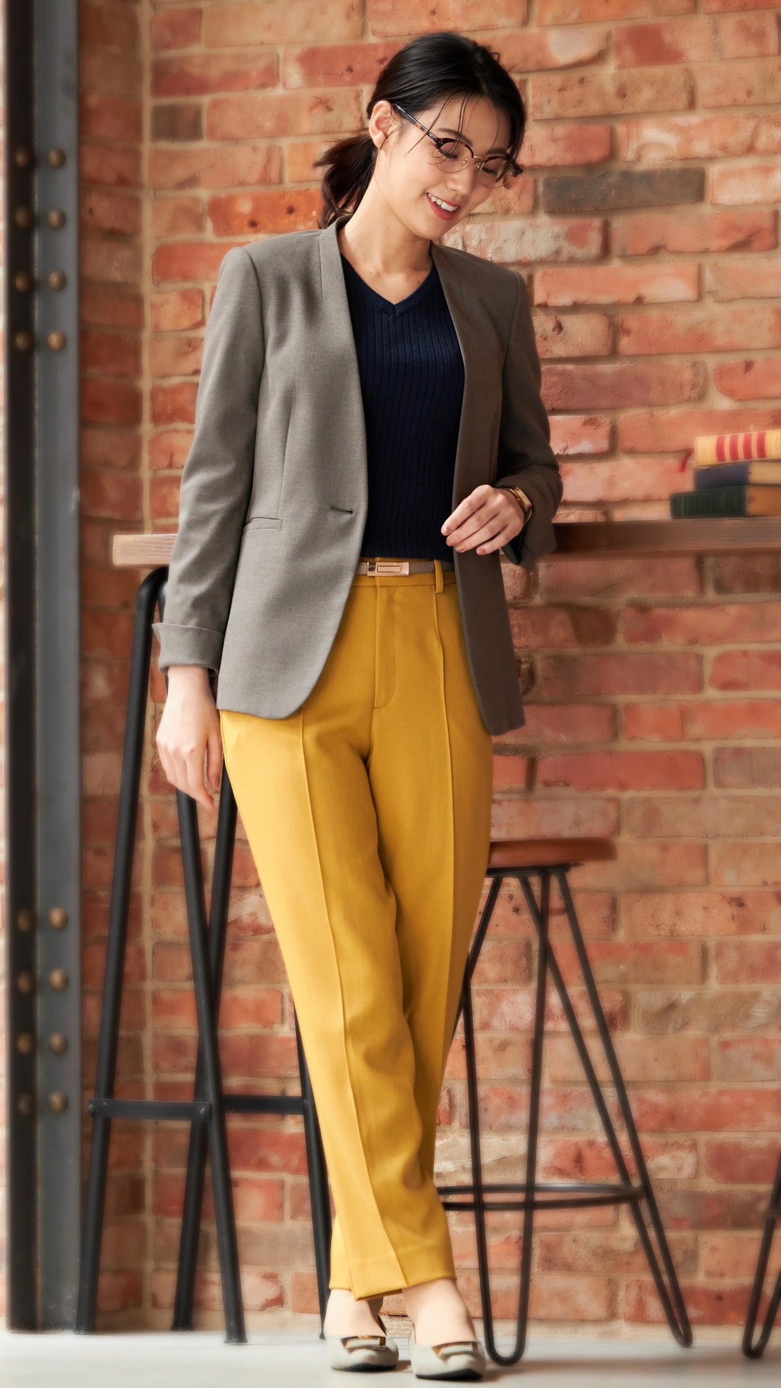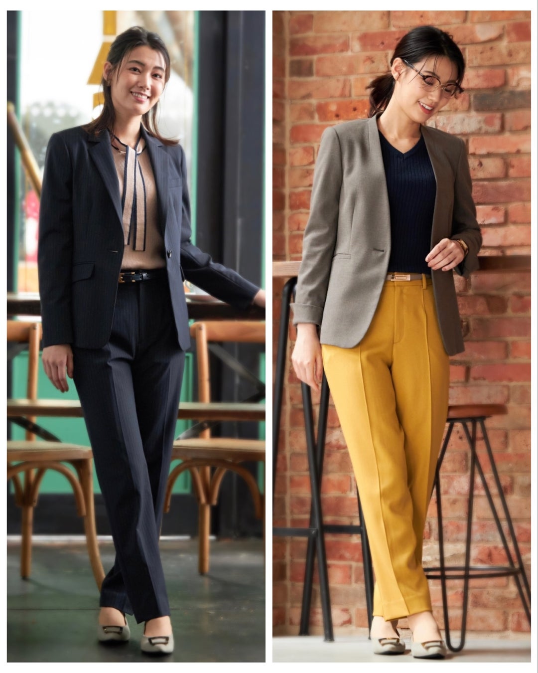 ① 着まわしやすくスーツインでも1枚でオフィスカジュアルにも着られる定番デザイン