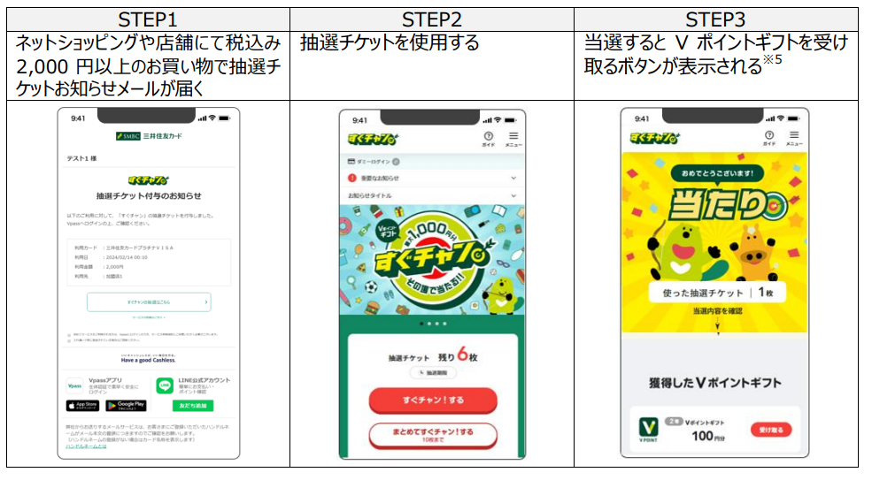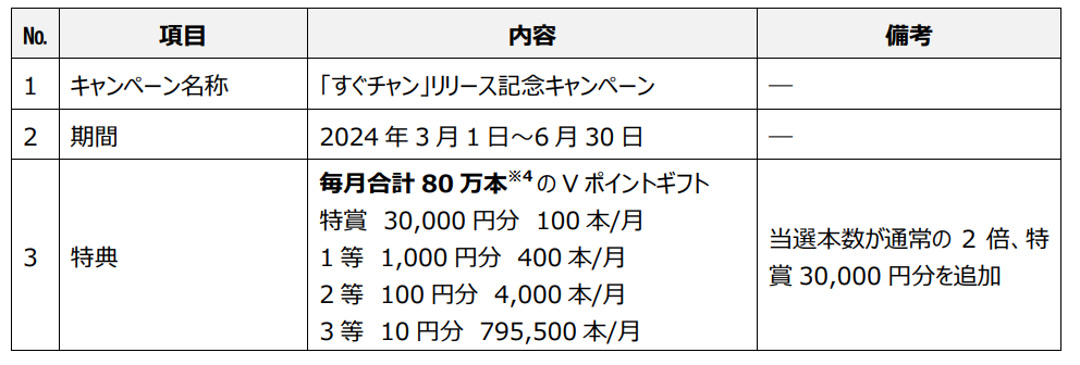 さらに、本サービスのリリースを記念し、より多くのお客さまに本サービスでの当選体験をしていただくべく、当選本数が通常の2倍となる「すぐチャン」リリース記念キャンペーンを開催します。本キャンペーンでは特賞としてVポイントギフト30,000円分が当たるチャンスもございますので、ぜひ奮ってご参加ください。