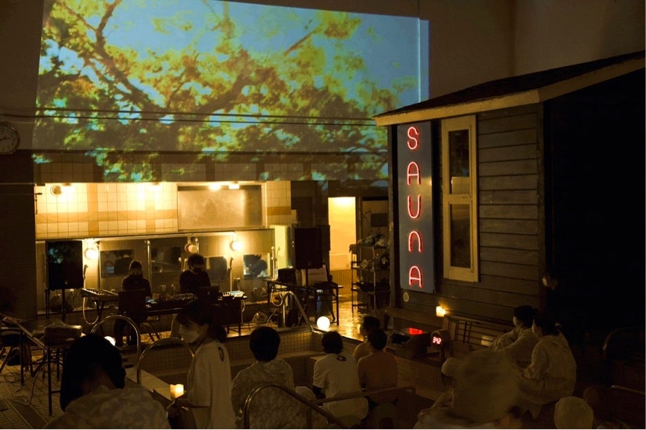 「Midnight SAUNA.」は、おふろcafe utataneの大浴場にて行われるライブイベント。男女が一緒にサウナ・おふろ・外気浴を楽しみながら、高さ約7mの浴室内という特殊な反響空間の中で音楽を楽しむことができます。