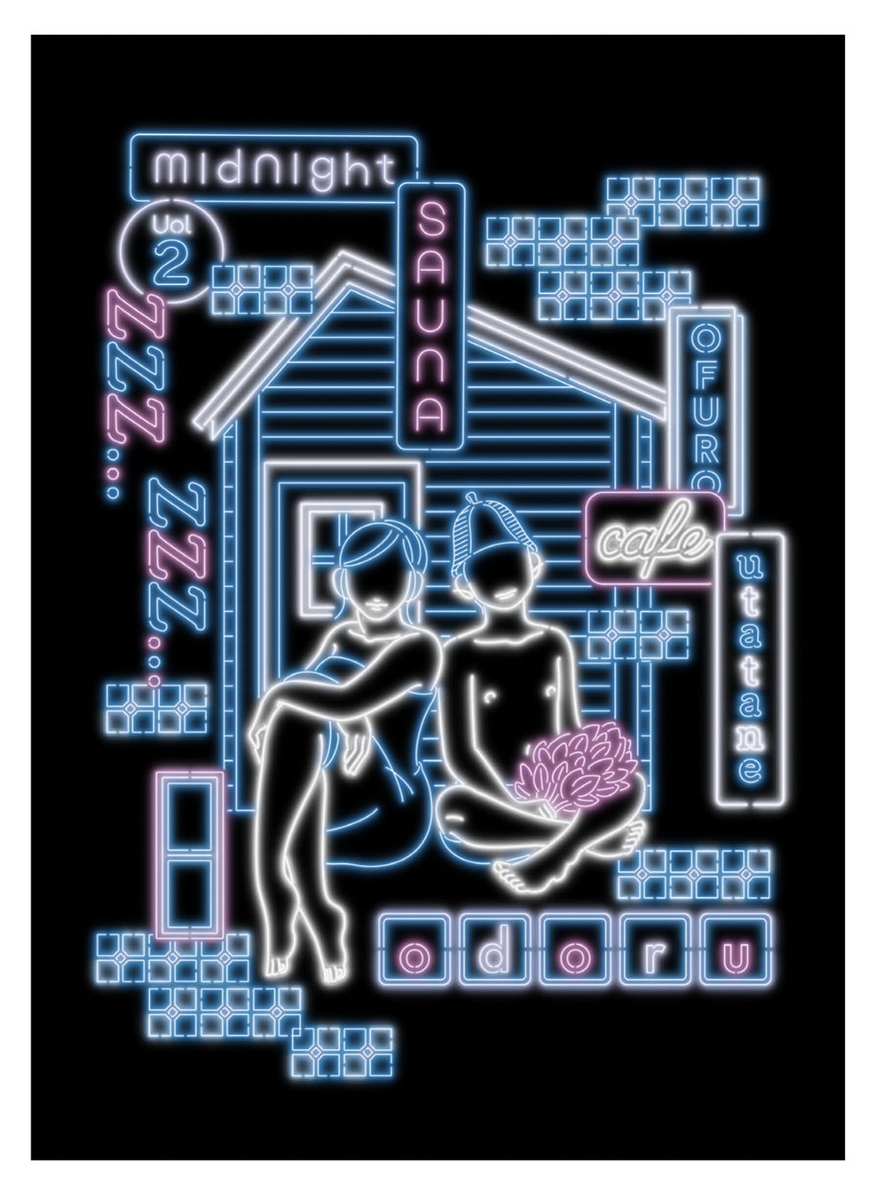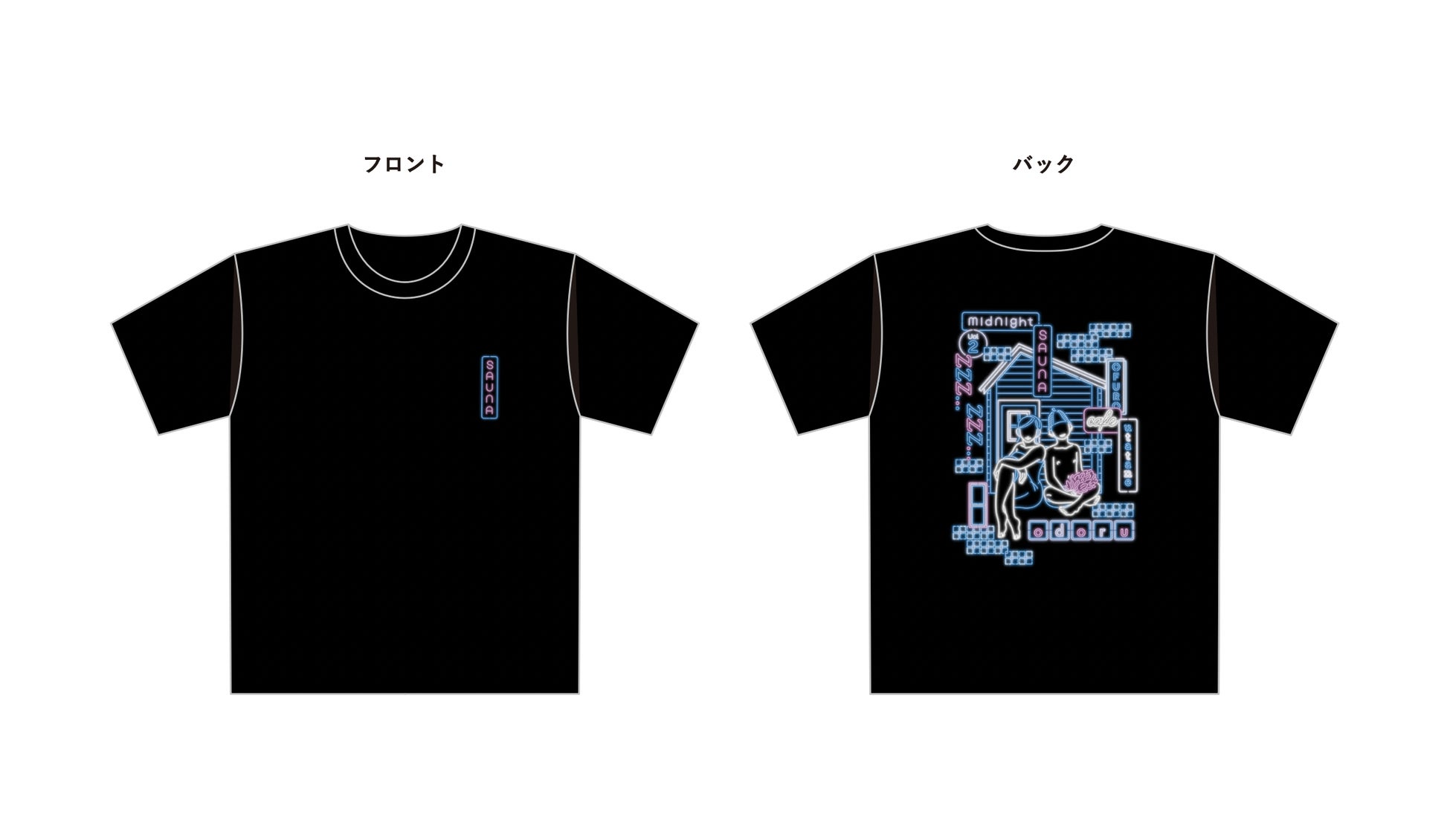 ネオン画家「はらわたチュン子」描き下ろしデザインのMidnight SAUNA.vol.2開催記念アパレルを数量限定での販売が決定。おふろcafe utatane店頭とオンラインショップ(https://cafeutatane.thebase.in/)にて4/16(土)より販売します。