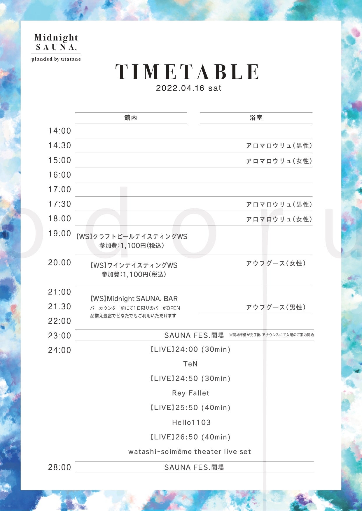 4/16開催。おふろcafe utatane浴室でのライブイベント「Midnight SAUNA.vol.2」のタイムテーブルやグッズを公開