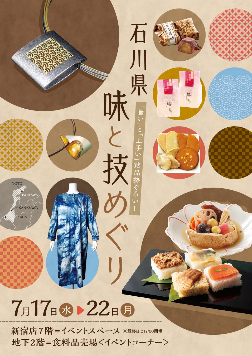小田急百貨店新宿店7階のイベントスペースでは、7月17日(水)~22日(月)の期間、「石川県 味と技めぐり」を開催します。見た目も華やかな笹寿しや上品な和菓子など石川県の伝統の味のほか、匠の技が光る工芸品を展開します。また、地下2階食料品売場のイベントスペースにおいても石川県のグルメが登場します。