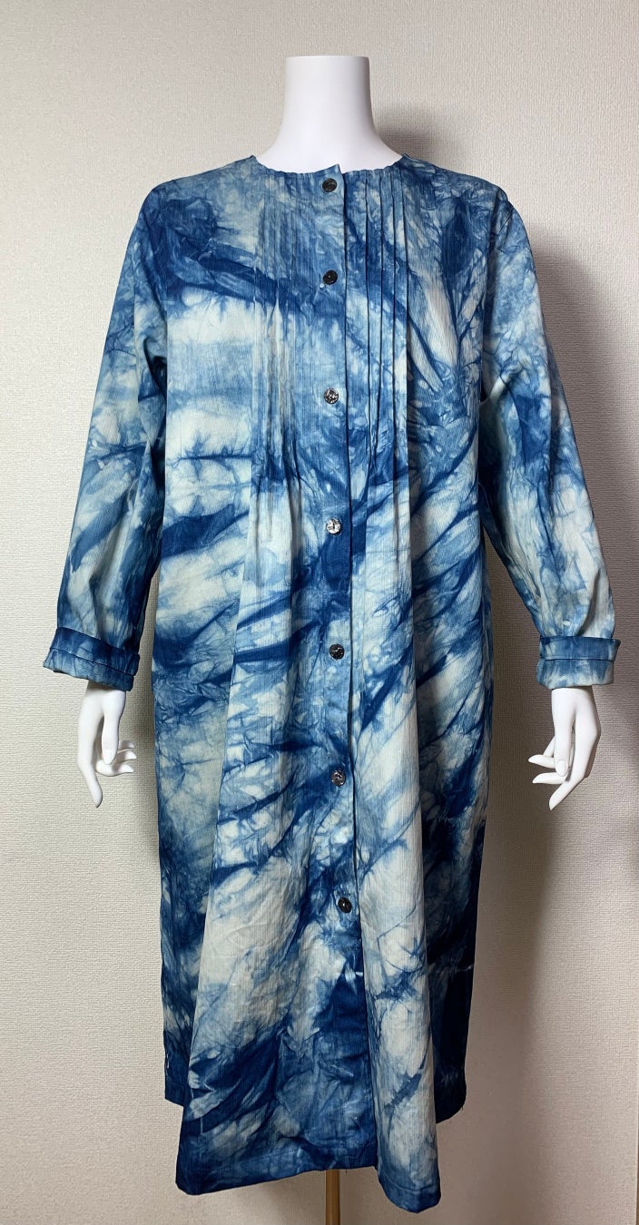 ワンピースや羽織りものとして使える、藍染を個性的に楽しめる一着です。