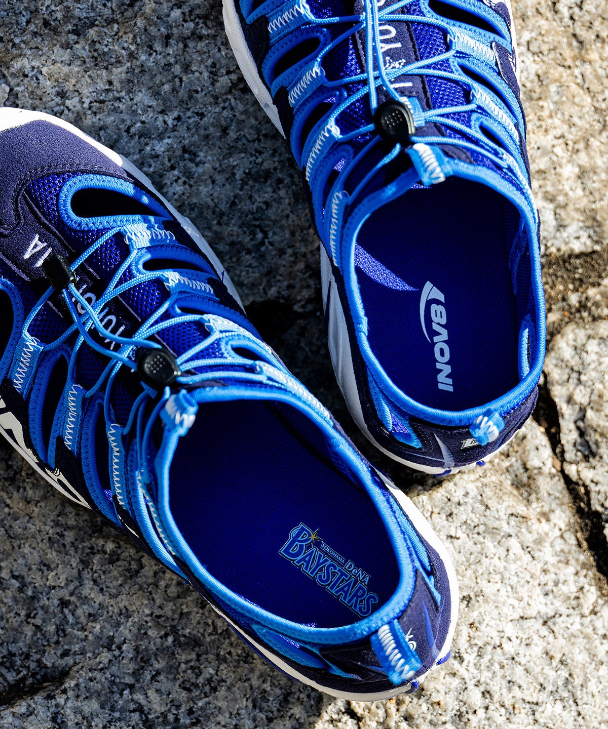 デザインは、横浜DeNAベイスターズのチームカラーである「ベイスターズブルー」をベースに、かかとにはチームのシンボルマーク、アッパー部分には「I ☆ YOKOHAMA(I LOVE YOKOHAMA)」の刺繍、インソールには『INOV8』のロゴを右足にチームロゴを左足にプリントした、ベイスターズ愛にあふれるスペシャル仕様です。