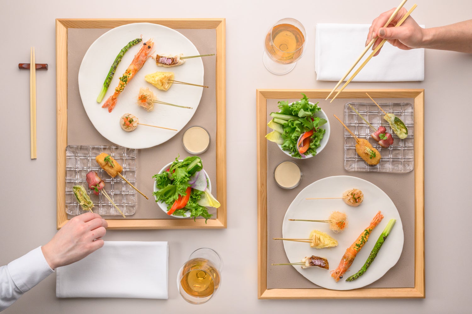 様々な食材を使用した串料理に、メインの肉料理やデザートまでお楽しみいただける大満足のコースに加え、オマール海老や和牛を使用した特製の軽食と串揚げがセットになったランチならではのお得なコースもご用意しております。