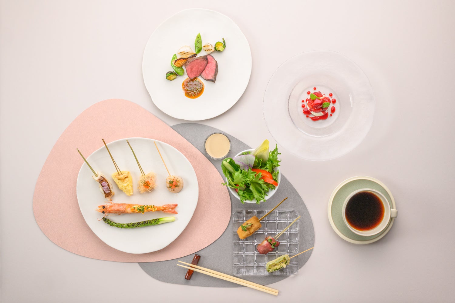 串揚げ、炭火串焼きをフレンチ仕立てにしたカジュアルなランチコース。ヘルシーサラダ、炭火串焼き3本、フレンチ串揚げ4本、デザート、コーヒーまでお楽しみいただけるフレンチと和が融合したカジュアルランチコース。