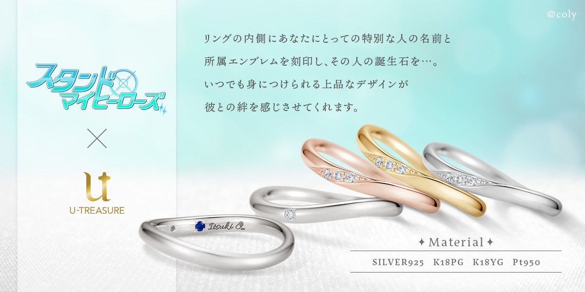 大人のための本格的なキャラクタージュエリーを扱うユートレジャー(東京都豊島区:代表取締役:伊藤 崇史)は、株式会社colyが配信するゲームアプリ「スタンドマイヒーローズ」とコラボした、初のウェーブラインのリング(指輪)を、8月17日(水)~9月20日(火)の期間限定で予約受付を行ないます。このたびの新作は、指輪の内側に26人の中から選んだキャラクターの誕生石を留め、彼の名前と所属エンブレムを刻みます。プラチナ、K18イエローゴールド、K18ピンクゴールドの3素材は、指輪の表にダイヤモンドを3石、シルバーにはキュービックジルコニアを1石留めています。ユートレジャーコンセプトストア池袋、ユートレジャーオンラインショップにて取り扱います。