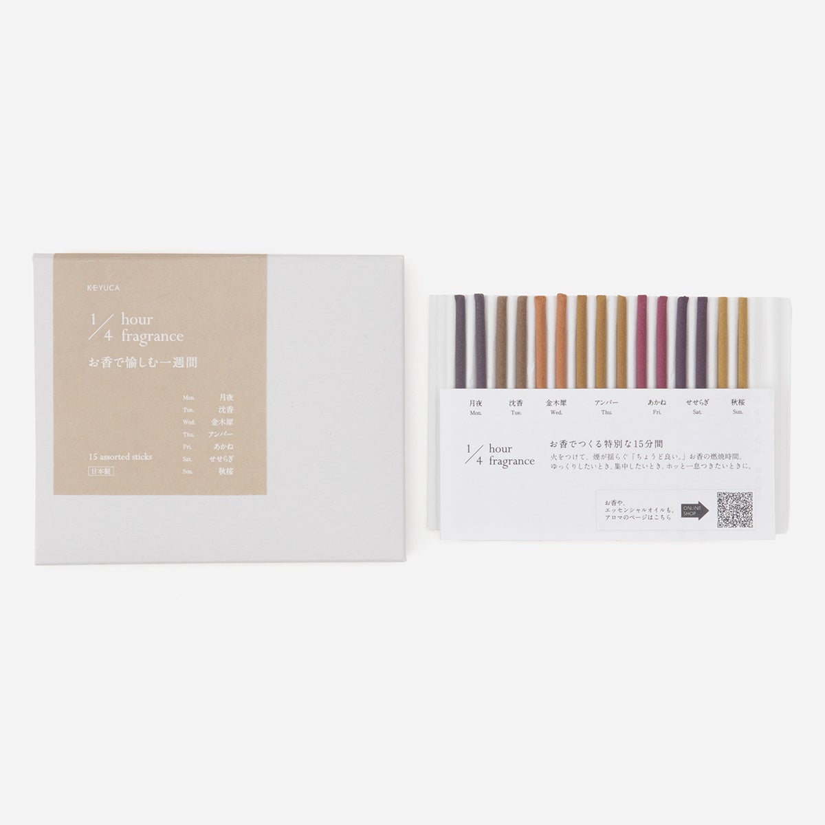 「月夜、沈香、金木犀、アンバー、あかね、せせらぎ、秋桜」の7種の香りをアソート。本商品は「1週間、毎日2本」というコンセプトで、穏やかに色付く「秋」を愉しめるような香りをケユカのデザイナーが厳選しました。