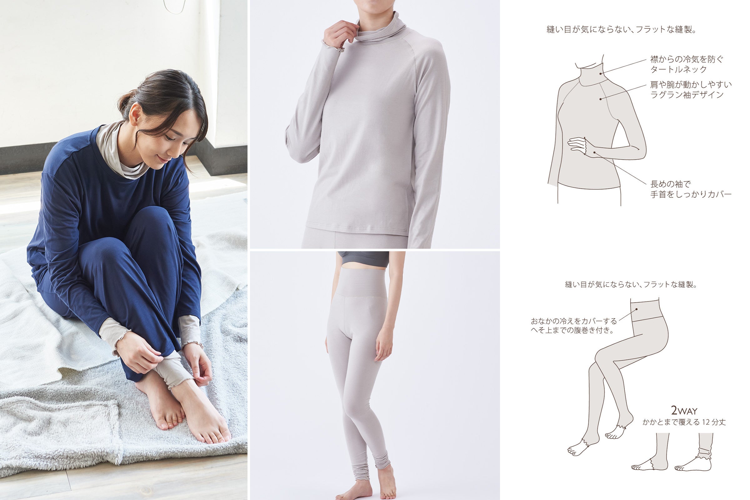 生地にはシルク由来の保湿加工(シルクフィブロイン加工)を施し、しっとりと柔らかな着心地の良い素材を使用。薄手で伸びよく肌触りの良い綿混生地で汗を吸収し、朝まであたたかく快眠をサポートします。また、体を動かしやすい設計で様々な寝姿勢にも対応。パジャマの下に着ることで、パジャマではカバーしきれない首・手首・足首を冷えから守ります。