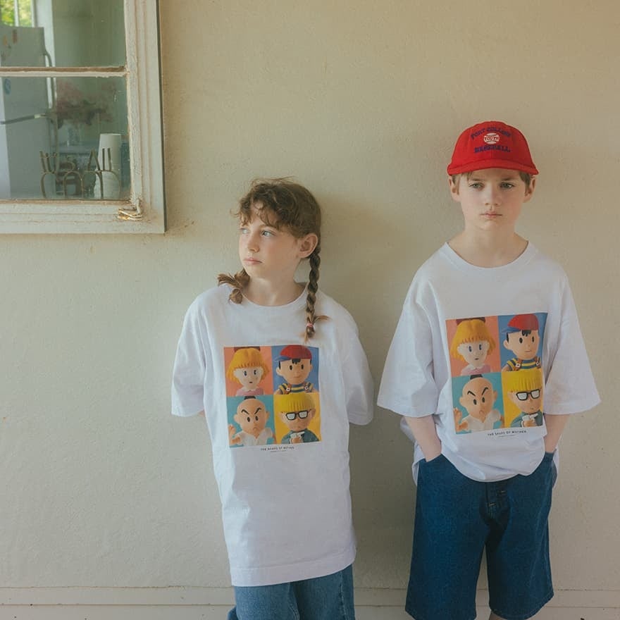 「MOTHERのかたち。」の公式ビジュアルのTシャツです。フルカラープリントされた『MOTHER2』の主人公たちは、当時の取扱説明書に掲載されていた公式粘土フィギュアを撮影したものです。