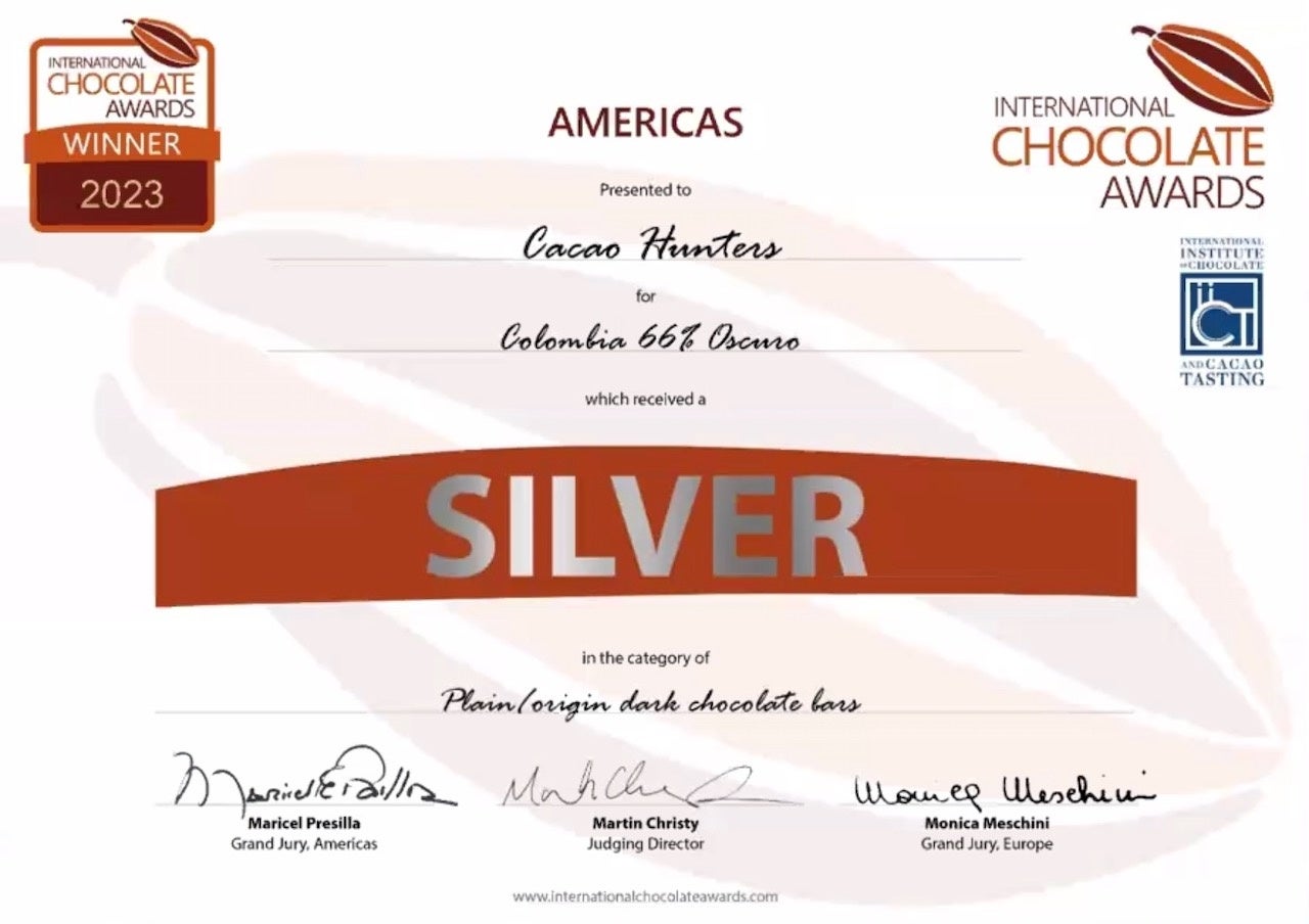 「カカオハンターズ(R)」が手掛けたチョコレートの中でも高評価だった今回の「スシロー用 特製ショコラタブレット OSCURO 66%(大会出店名 COLOMBIA 66% OSCURO)」が世界的に権威のあるインターナショナル・チョコレート・アワード アメリカ大会 2023に出品されました。その結果、プレーン/オリジン ダークチョコレートバー部門 銀賞を受賞しました。そんな世界的に評価されたチョコレートをふんだんに使ったスイーツをお楽しみください。