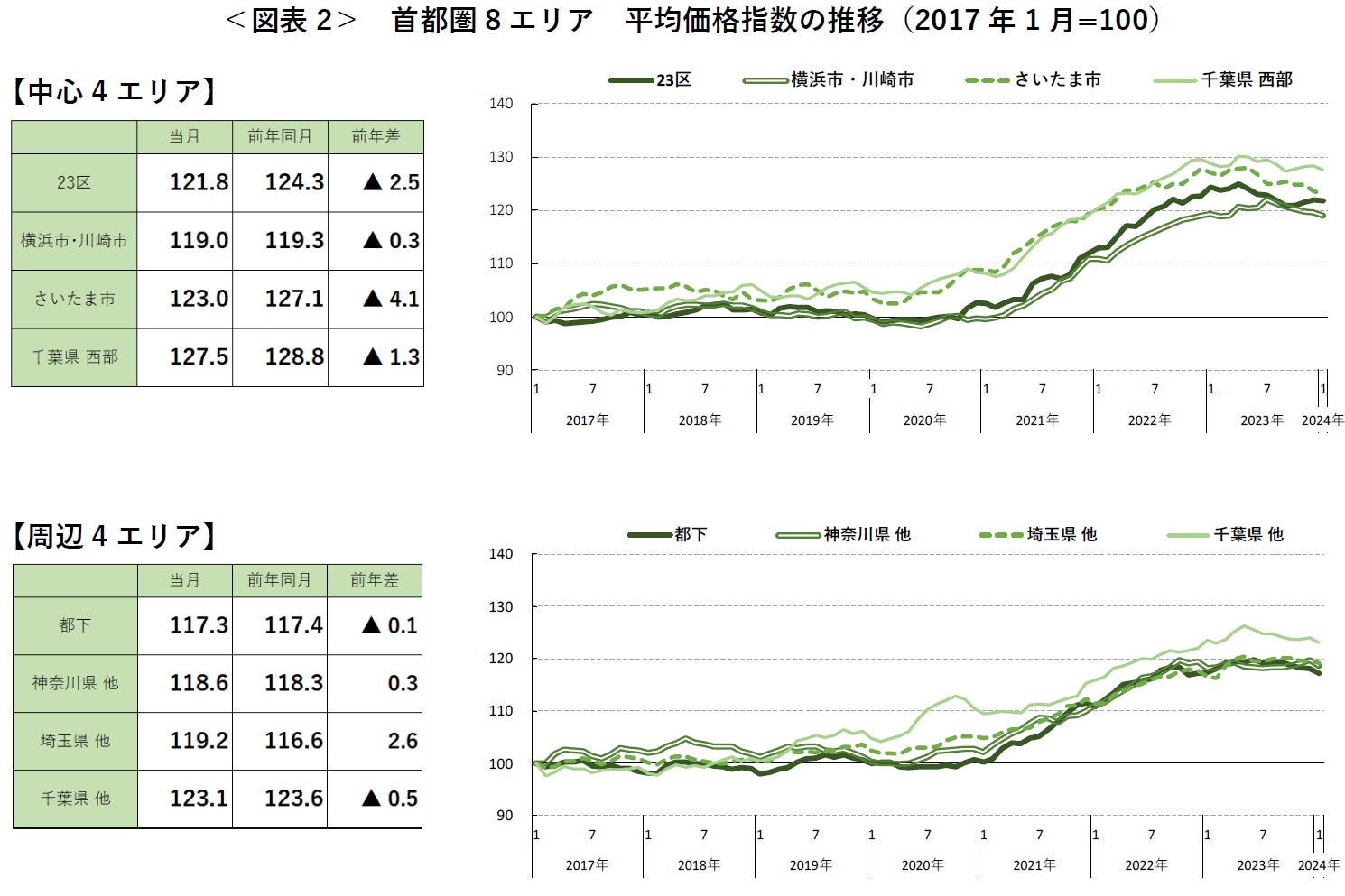 なお、前年同月比は東京都下、横浜市・川崎市がともに38カ月ぶり、千葉県他が27カ月ぶりの下落となり、6エリアで前年割れとなった。