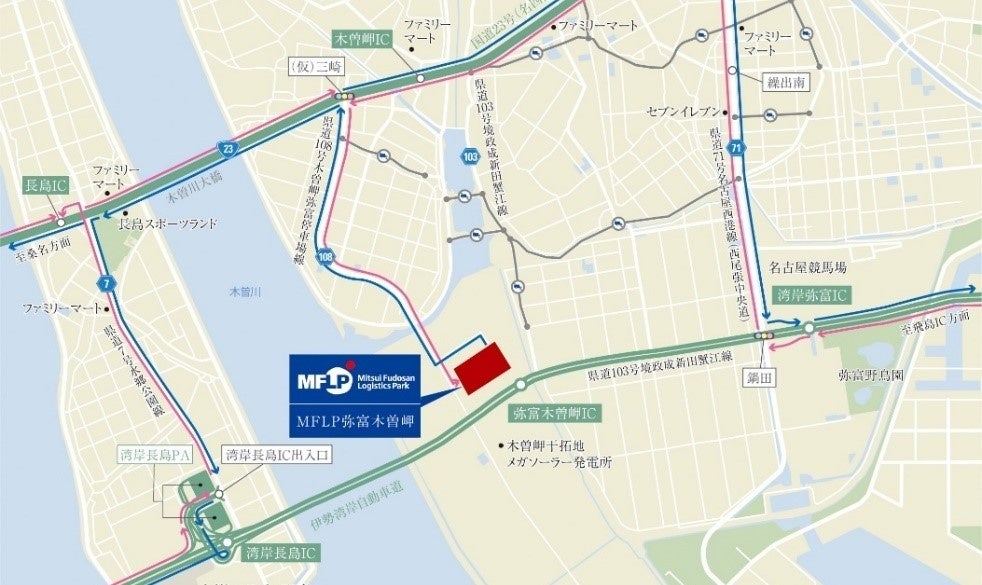 「MFLP弥富木曽岬」は、伊勢湾岸自動車道の3つのインターチェンジ(以下「IC」)「湾岸弥富IC」「湾岸長島IC」「弥富木曽岬IC」に近接し、首都圏と関西圏を結ぶ輸送網の中継地となり、中京圏の産業集積エリアである伊勢湾や、名古屋港における物流ニーズに対応します。