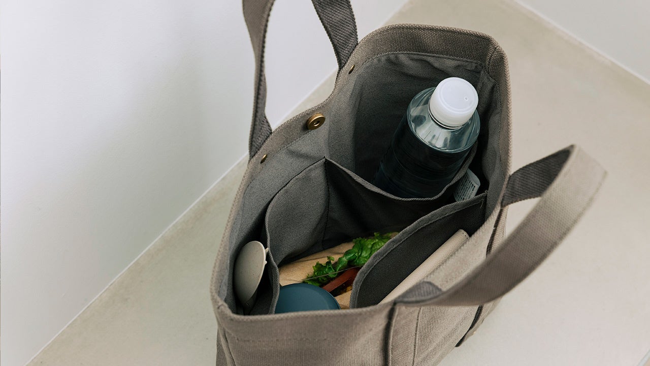 マチをコンパクトにすることで、中身を安定して持ち歩きやすくなっています。ペットボトルやマグボトルも縦にすっぽり入る高さで、ランチバッグにもぴったりです。