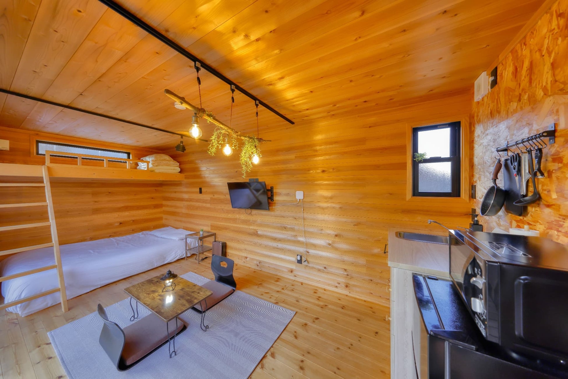 最大6名まで宿泊可能なログハウス。専用のバレルサウナやリラックススペースでおくつろぎいただけます。