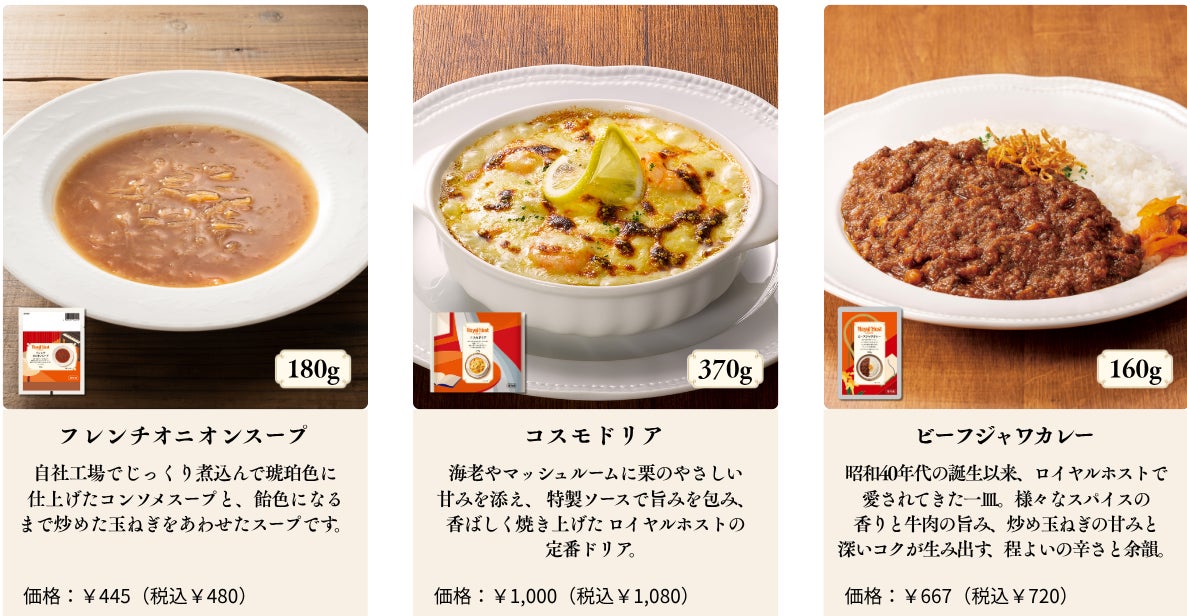 本ブランドでは、ロイヤルホストの人気メニューを中心に、スープ、メインディッシュ、カレー、グラタン、スイーツまで幅広くラインナップをご用意しております。ご家庭でもレストランのような華やかさや贅沢感を楽しんでいただける洋食を中心に取り揃えています。