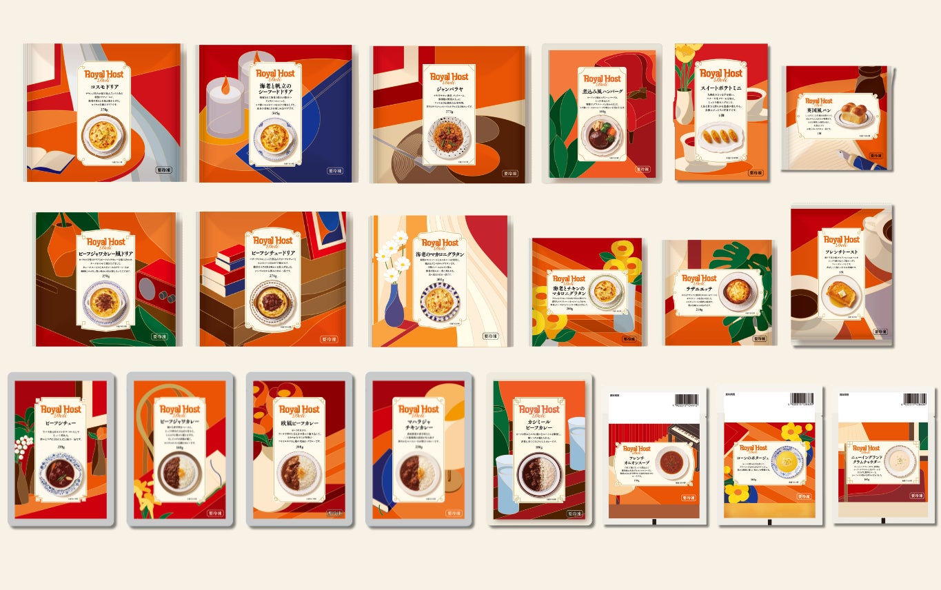 また、ロイヤルホストの店内を想起させる温かみのあるオレンジ、ブラウン、グリーンを基調に、商品ごとに異なるパッケージデザインを採用。それぞれの料理に込められた想いや手間ひまかけたこだわりを、デザインを通じても丁寧に伝えています。
