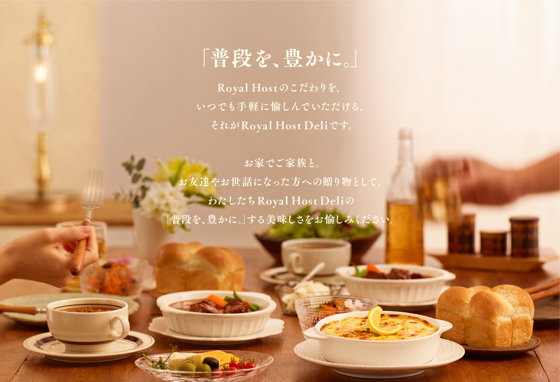 「Royal Host Deli」は、ロイヤルグループのセントラルキッチンが長年培ってきた“美味しさ”を、より身近なかたちでお届けしたいという想いから誕生いたしました。いつもの食卓にロイヤルホストの味が加わることで、大切な人とのお食事が、よりあたたかく、「普段を、豊かに。」なることを目指してまいります。