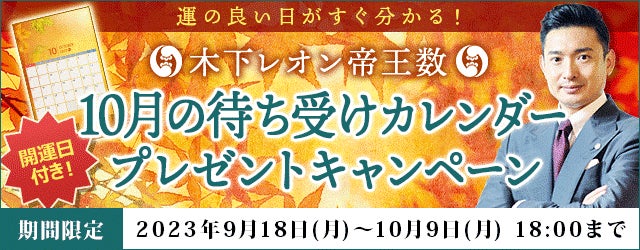 フジテレビ系列で放送中の占い番組『突然ですが占ってもいいですか?』で人気を博している木下レオン。ただいま、月額公式サイト『木下レオン◆帝王数』にて、『10月の待ち受けカレンダープレゼント』キャンペーンを開催中です。期間中、対象の占いメニュー購入で、その月の開運日がひと目で分かるオリジナル待ち受けカレンダーがついてくるお得なキャンペーンとなっております。ぜひこの機会にお試しください。