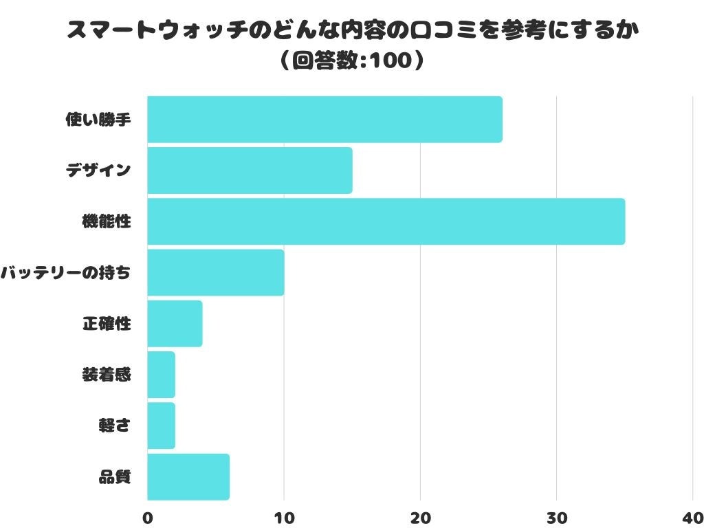 スマートウォッチのどんな内容の口コミを参考にするかをアンケートにて調査したところ、1位は「機能性」 でした。