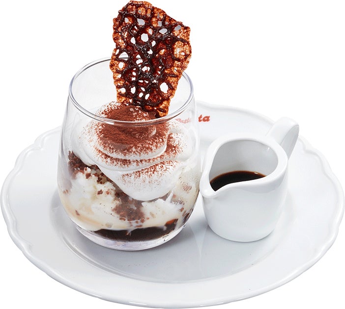 コーヒーゼリーとミルクグラニータ、チョコクランチ、ふんわりホイップをあわせ、ティラミス風に仕上げた一品です。ぷるぷるのコーヒーゼリー、シャリシャリのグラニータ、サクサクのチョコクランチ、クリーミーなふんわりホイップのマリアージュをお楽しみください。別添えの冷たいエスプレッソを加えると、よりすっきりとした、大人の味わいへの変化をご堪能いただけます。
