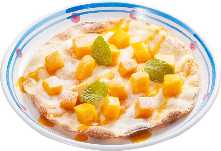レアチーズ風味のクリームを塗ったピッツァに、たっぷりのひんやりマンゴーとマンゴーソースをトッピングしました。爽やかな味わいが夏にぴったりです!