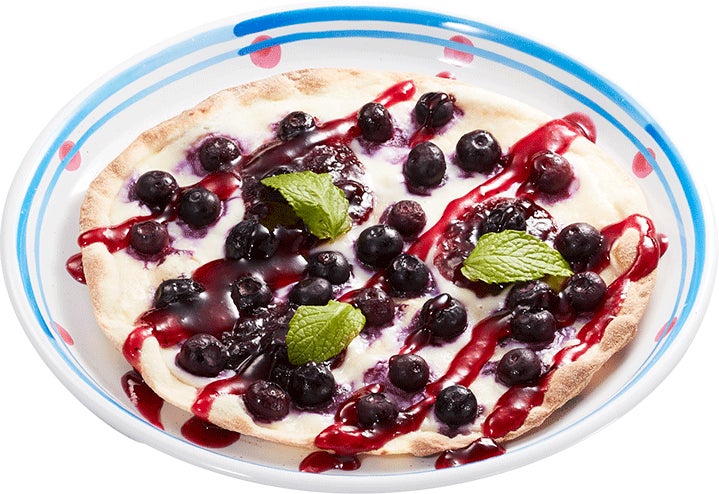 レアチーズ風味のクリームを塗ったピッツァに、ブルーベリーの果肉、ジャム、ソースをトッピングしました。程よい酸味のブルーベリーと、レアチーズのさっぱりとした味わいが相性抜群です。