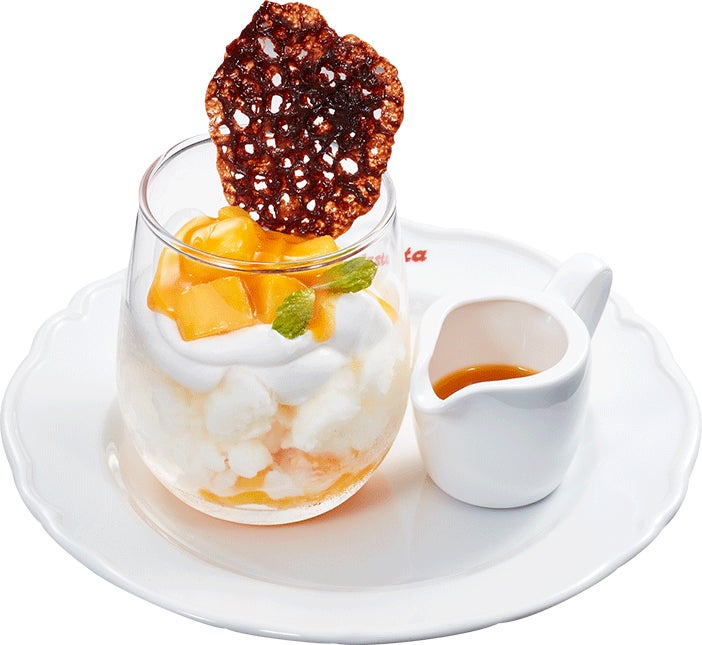 ミルクグラニータにマンゴーの果肉とソース、ふんわりホイップをあわせ、パフェ仕立てにした一品です。トップにはサクサク食感のチョコチュイルをあしらいました。マンゴーの爽やかな味わいや、ミルクグラニータのシャリシャリ食感をご堪能ください。別添えのマンゴーソースを加えると、より濃厚なマンゴーの風味をお楽しみいただけます。