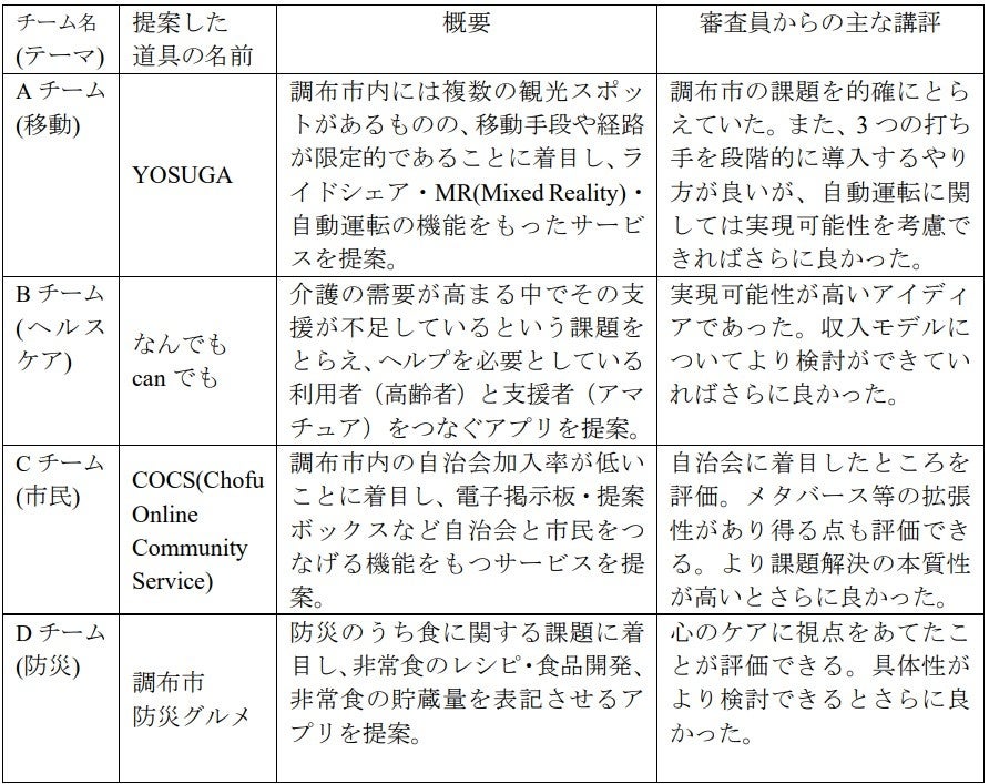 参加した学生からは、「大学の授業ではなかなか経験できない地域の課題検討や企画提案が楽しかった」、「他大学の学生や社会人の方と交流するよい機会を得た」、「調布市やスマートシティに関する理解が深められた」など、多くの感想が寄せられました。