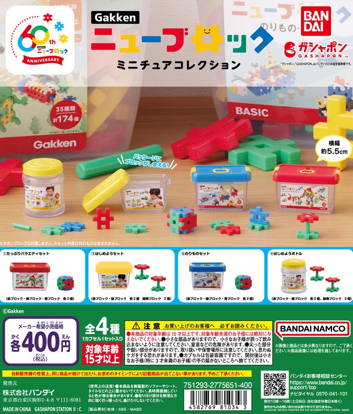 株式会社バンダイ ベンダー事業部(本社:東京都台東区)は、「Gakkenニューブロック ミニチュアコレクション」(1回400円・税10%込、全4種)として2025年3⽉第5週から順次、全国のガシャポンバンダイオフィシャルショップ、玩具売場、量販店、家電店などに設置されたガシャポン⾃販機シリーズにて発売いたします。