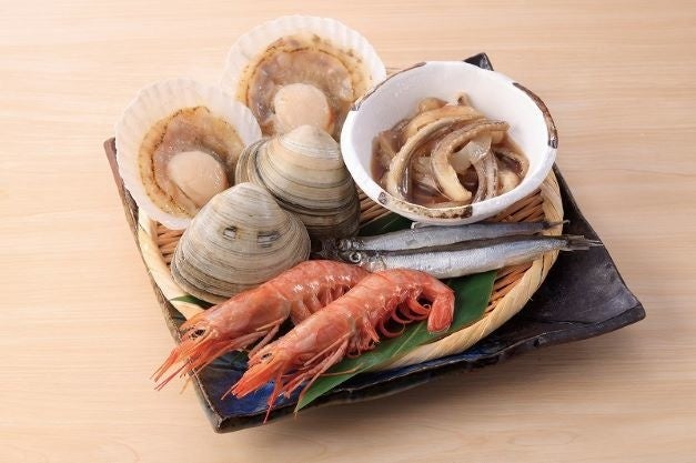 帆立・活白はまぐり2ヶ、赤海老・子持ちししゃも2尾