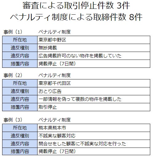 「実在する物件の情報を一部変更して掲載している会社がいる」とユーザーから報告を受け、当社で調査を行ったところ、複数の物件で物件価格や築年月、建物面積などの数字を一部変えて掲載していたことが判明。また過去には、広告掲載許可のない物件を無断で掲載し、掲載停止措置を受けていました。該当の不動産会社は、当社からの事実確認に対し報告の内容を認めたため、今回と過去のルール違反を踏まえ、ペナルティ制度に則り退会措置を取りました。