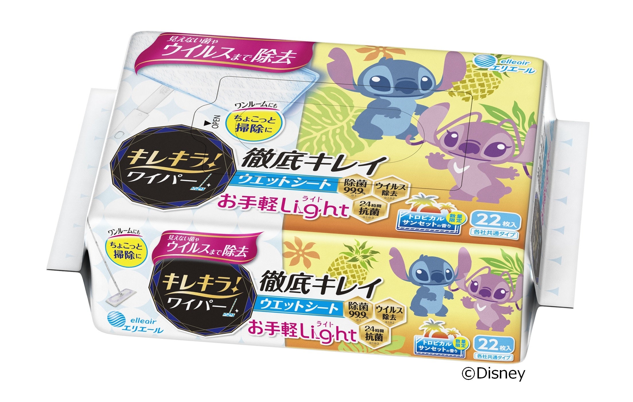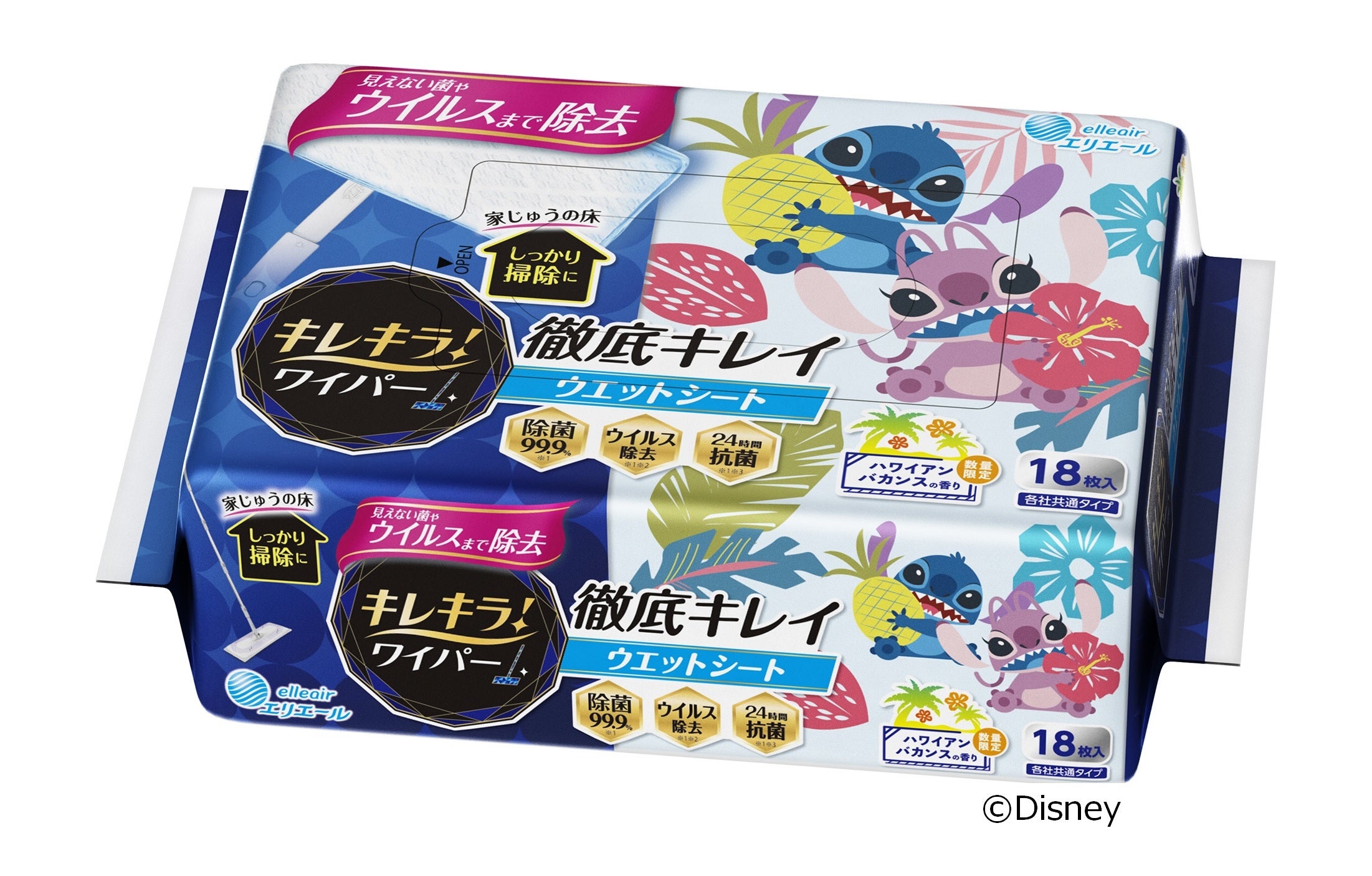 「キレキラ®!ワイパー 徹底キレイ ウエットシート」は、除菌99.9%※3、ウイルス除去※3※4、24時間抗菌※3※5機能付きで、ベタつき汚れはもちろん、床の菌やウイルスまで除去できる商品です。独自の薬液と凸凹シートでスーッと軽いふき心地ながらも、汚れをしっかりかきとります。水分たっぷりの厚手シートで、適度な洗浄液がしみ出し、約30畳※6ふくことができます。今回、数量限定で発売するディズニーデザインパッケージは、今年、映画公開20周年の『リロ&スティッチ』の舞台であるハワイにちなみ、レギュラータイプはハワイの青い空と海をイメージした爽やかで元気な「ハワイアンバカンスの香り」、ライトタイプはハワイの夕暮れとビーチをイメージした優しく安らぐ「トロピカルサンセットの香り」を採用。パッケージだけでなく香りでもスティッチの世界を感じられ、お部屋を彩るとともに、お掃除時間を楽しくするアイテムとして展開します。ふき掃除は手間と時間がかかるもの、と思われていた従来の概念を変えるため、「キレキラ®!」では、その名称に込められた“キレイを気楽に”をテーマに、今後も住居用掃除用品市場に新商品をお届けしてまいります。